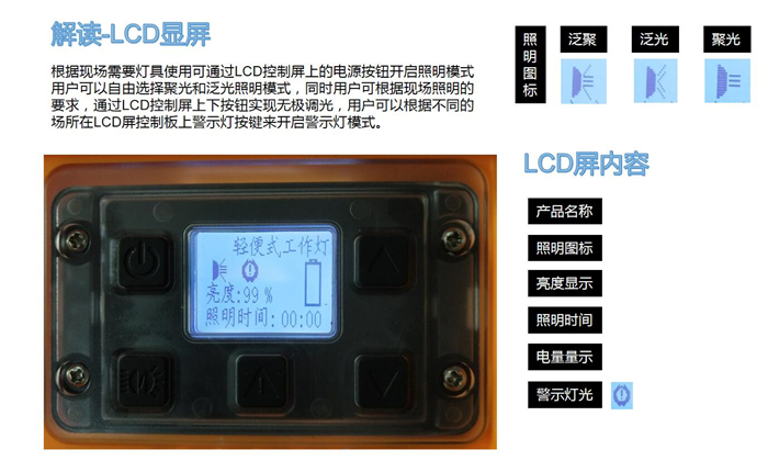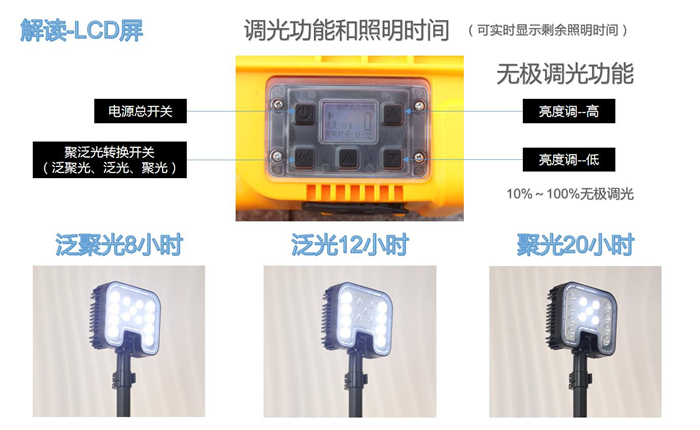 4、針對不同的照明模式,可手動進行10-100%的無極調(diào)光,同時可在LCD顯示屏上直觀的顯示剩餘電(diàn)量,預算可繼續工作時間。