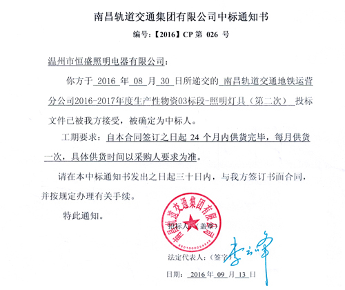 近日,通過各方努力,大家共同奮鬥(dòu),恒盛照明企業接到南昌地鐵項目中标通知書,獲得爲期兩年的地鐵運營燈(dēng)具合約。全文如下: